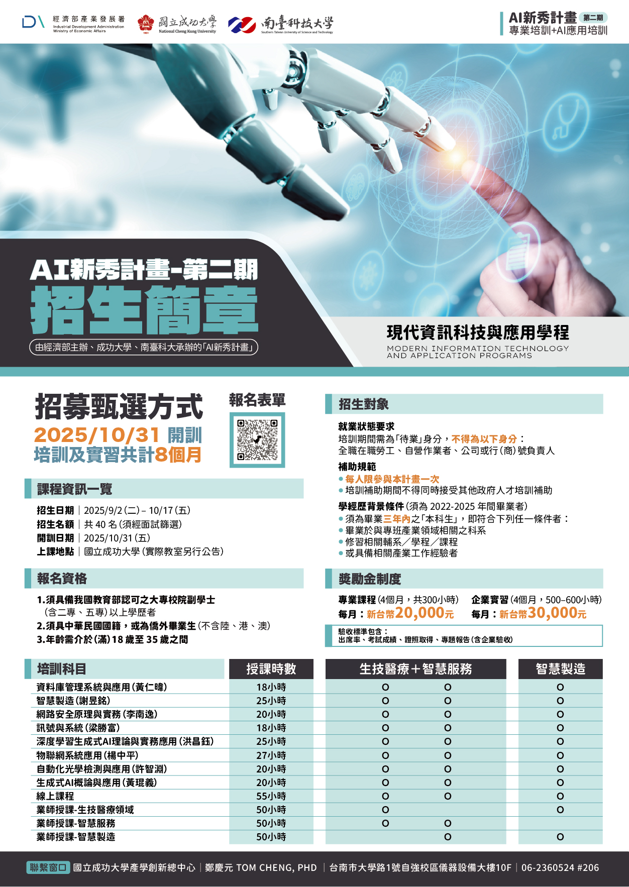 此計畫由成大與南台科大聯合設計,課程包含AI基礎、深度學習、資料管理、智慧製造、網路安全、物聯網等最務實主題,並結合300小時以上AI應用實作,完整鏈結企業專案與職場場域,累積跨域實戰經驗。培訓後直接媒合產業實習,畢業即戰力無縫接軌,成為產業搶手AI人才!