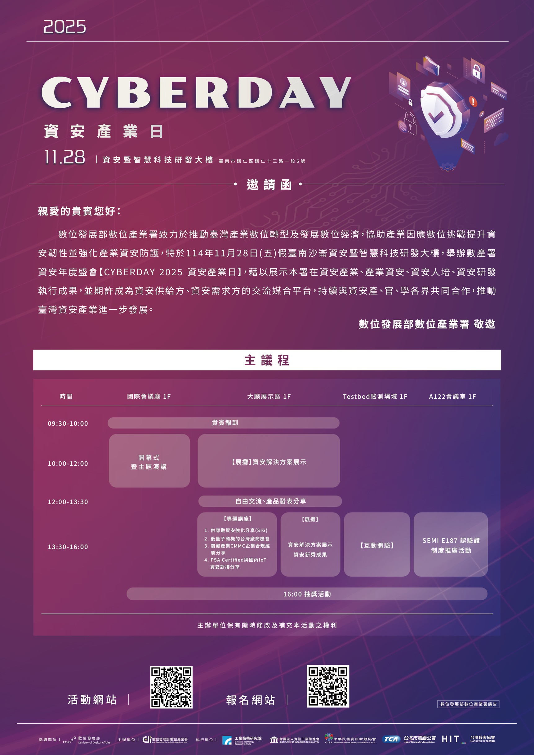 數位發展部數位產業署致力於推動臺灣產業數位轉型及發展數位經濟,協助產業因應數位挑戰提升資安韌性並強化產業資安防護,將於2025年11月28日(五)舉辦【CYBERDAY 2025 資安產業日】,藉以展示本署在資安產業、產業資安、資安人培、資安研發執行成果,並期許成為資安供給方、資安需求方的交流媒合平台,持續與資安的產、官、學各界共同合作,推動臺灣資安產業進一步發展。